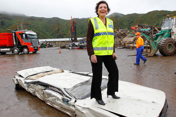 A grinning Police Minister Anne Tolley pressed the button to crush the Nissan Laurel at a Lower Hutt scrap metal yard.
