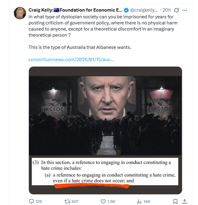 Update: 17-1-26. Australian Senator Matt Canavan has made a submission to the Parliamentary Inquiry labeling Labour’s ‘The Combatting Antisemitism, Hate and Extremism Bill 2026’ Unconstitutional and Undemocratic.