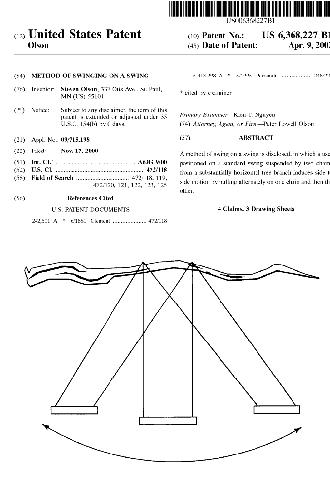 The patent office initially rejected the application for prior art – citing two earlier patents on swings – but Peter Olson appealed, noting that neither was a method for swinging sideways. The patent was then issued.
